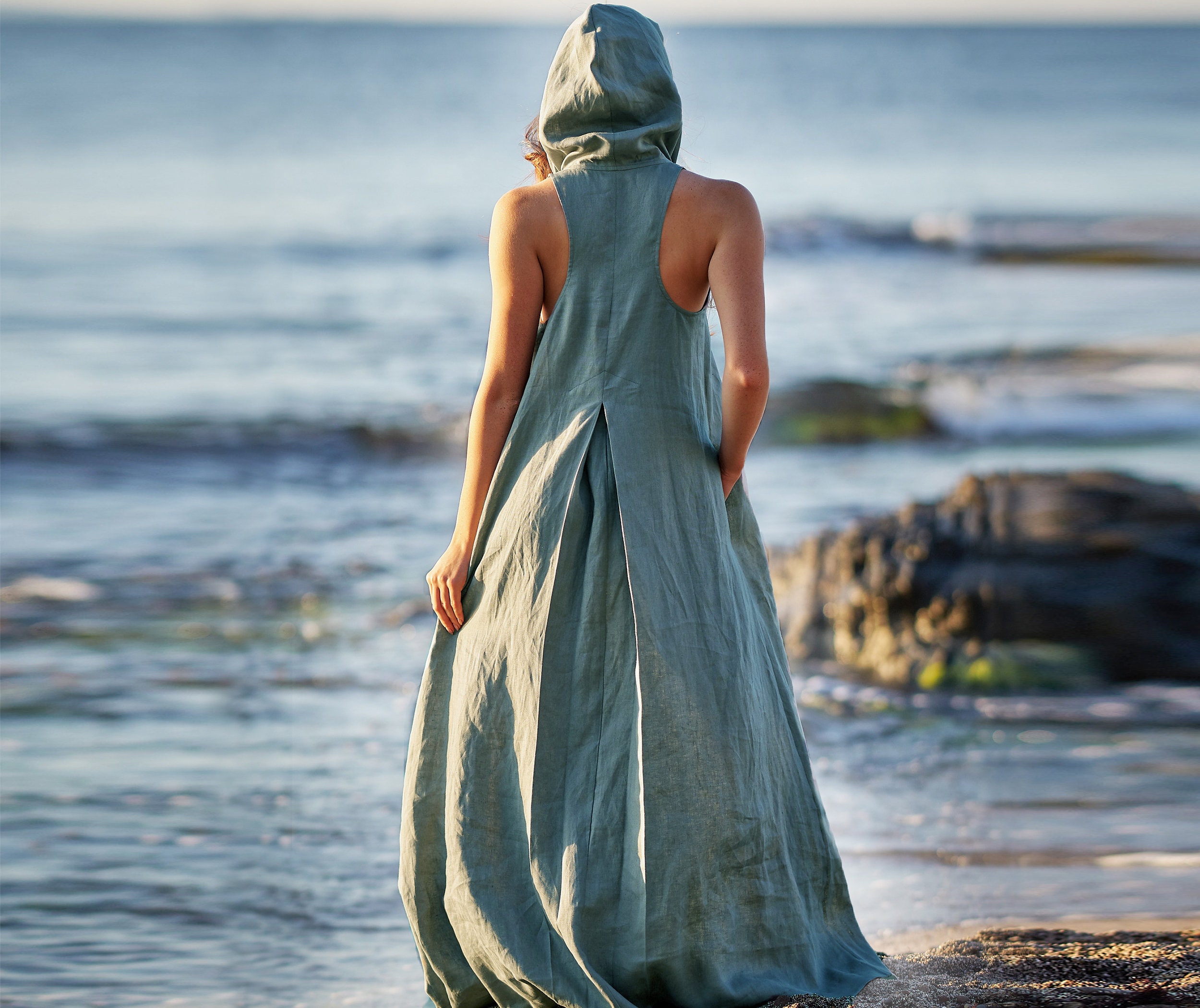 Dusty Turquoise Linen Dress Maxi Hooded Boho For
