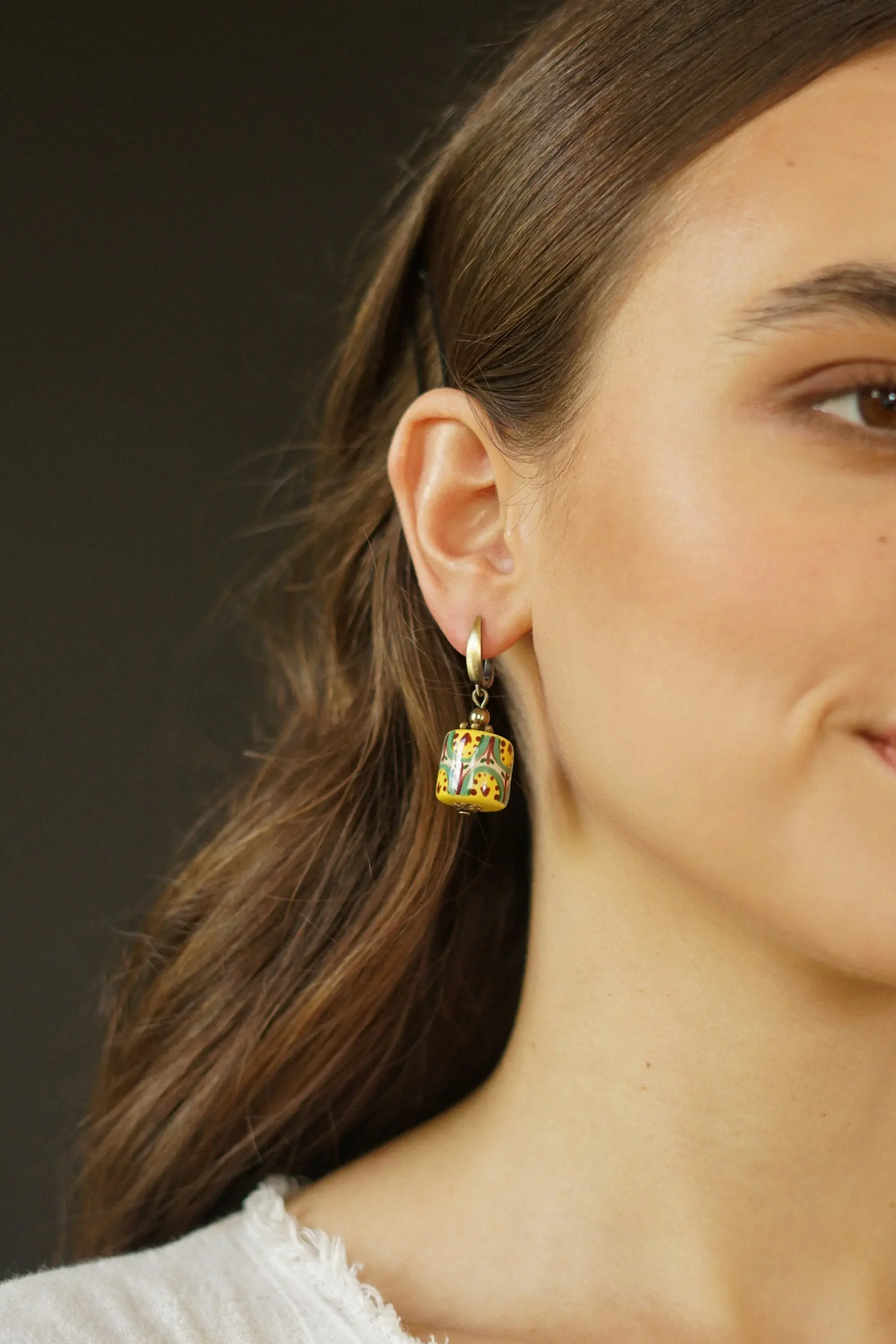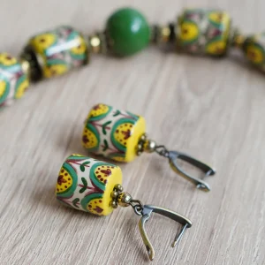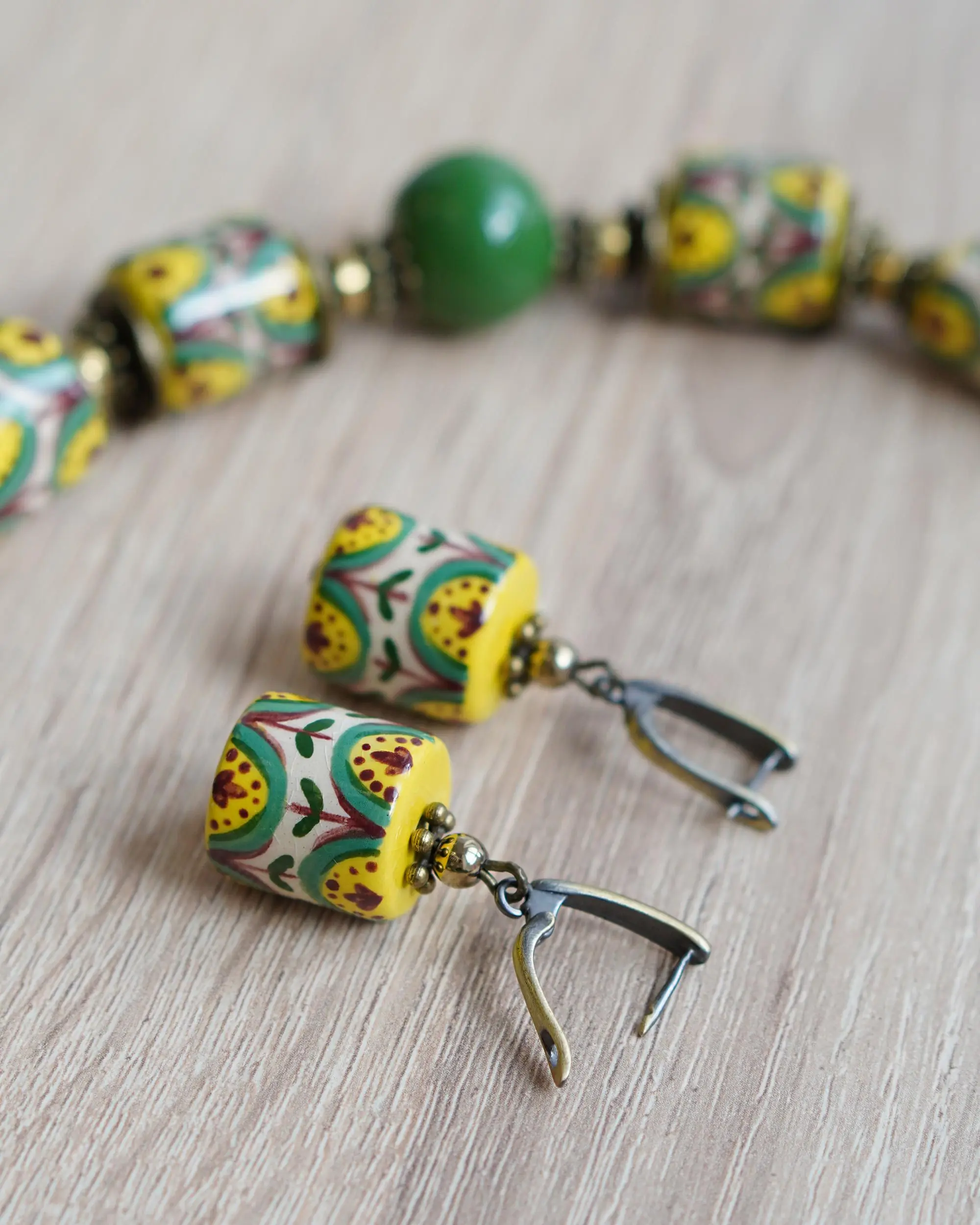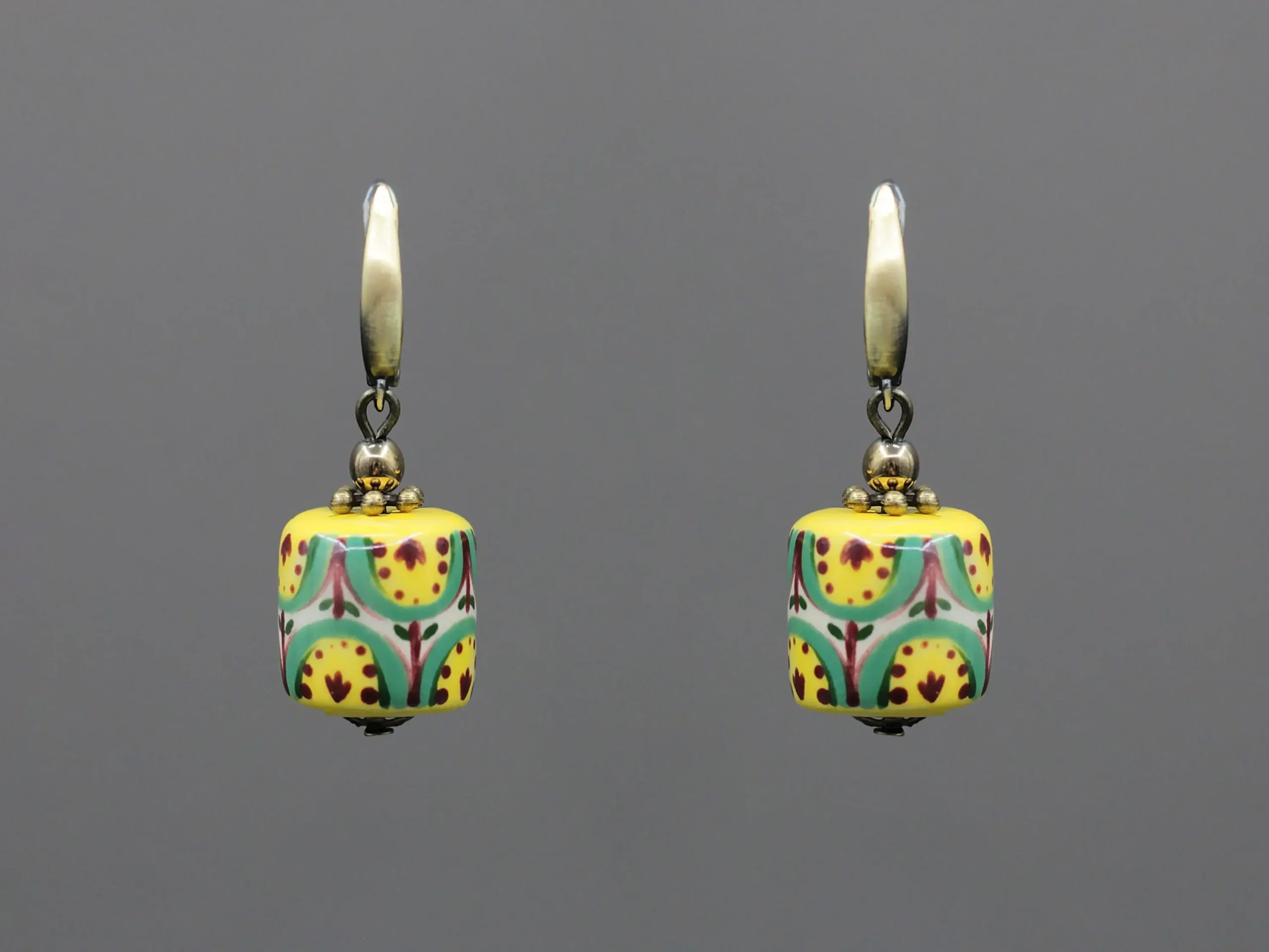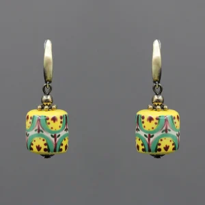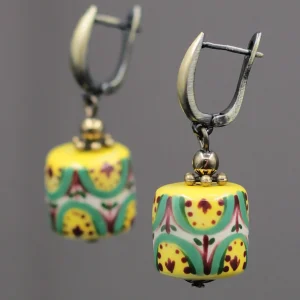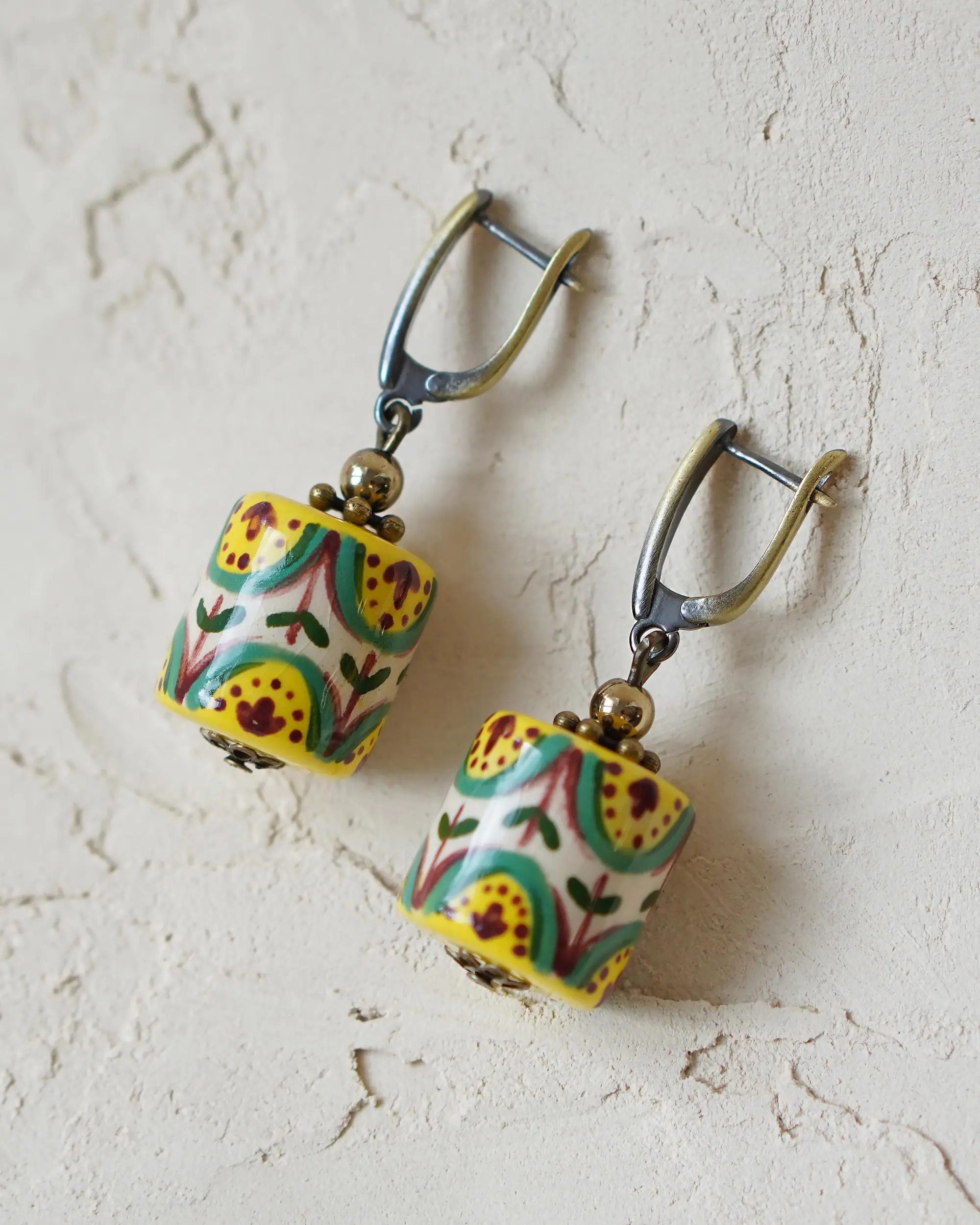 These handmade ceramic earrings feature a traditional Kosiv floral pattern, inspired by the rich heritage of Ukrainian folk art. Originating from the Hutsul region, Kosiv ceramics are known for their vibrant colors, symmetrical motifs, and nature-inspired designs. Each bead is hand-painted with care, reflecting centuries-old craftsmanship in a modern, wearable form. Full of character, these earrings are a beautiful tribute to cultural tradition.