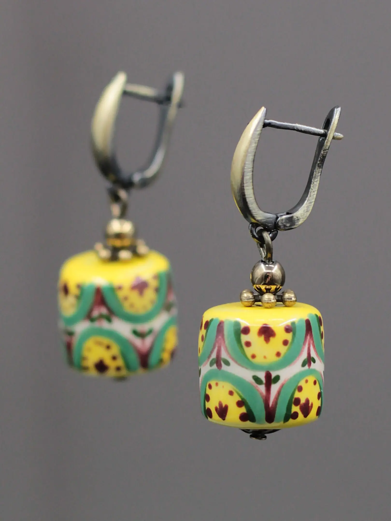 Handmade white clay beads, coated with glaze and original painting; tinted hematite; bronze-colored findings.