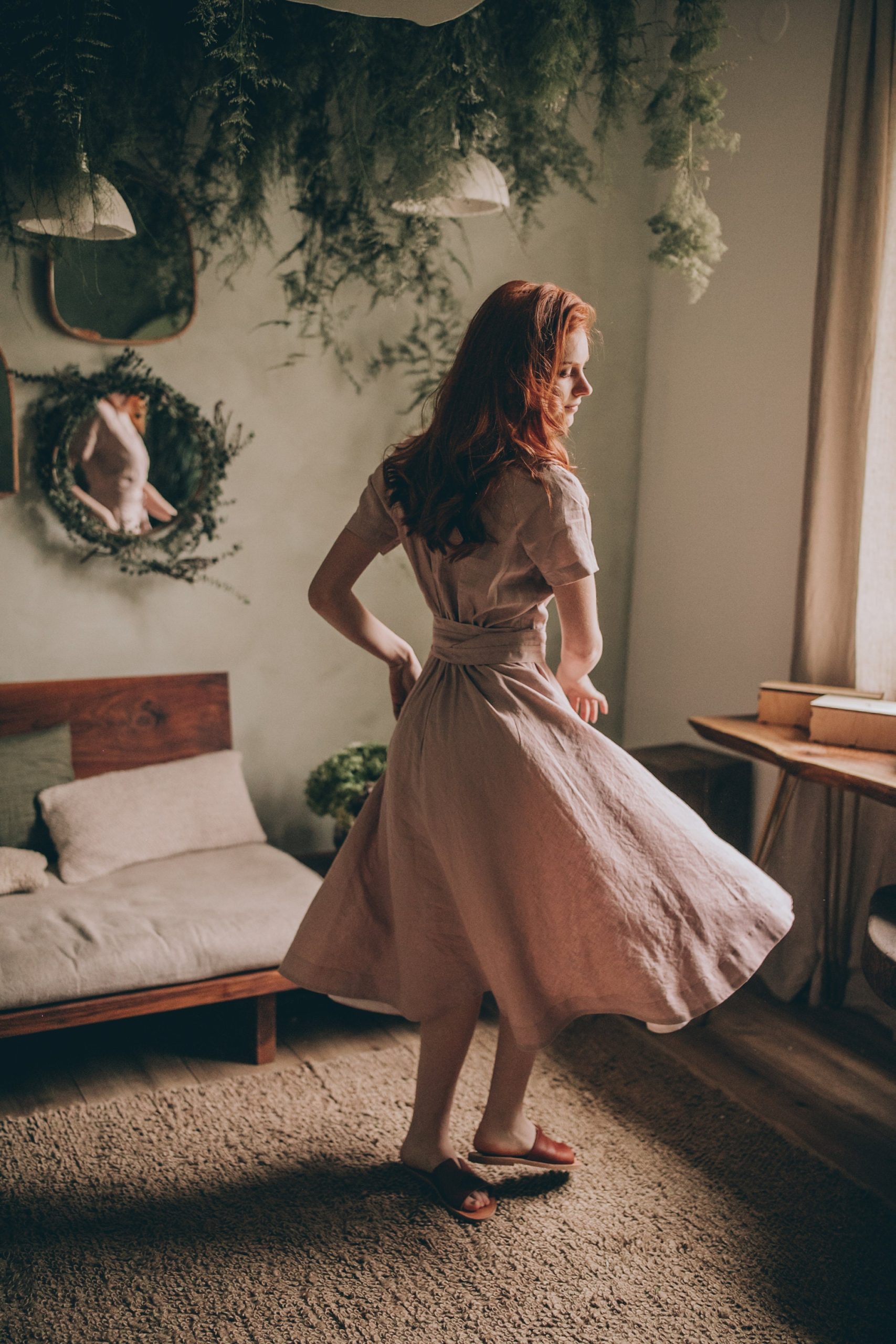 The stylish linen dress, with tie waist and pockets is all about the elegance and style. The essential summer green linen dress made from 100% high quality linen. This comfortable midi length dress has a surplice neckline, side pockets and a band that emphasizes the waist. Featured in a amethyst shade here, this delightful linen piece could be made in a variety of colors.