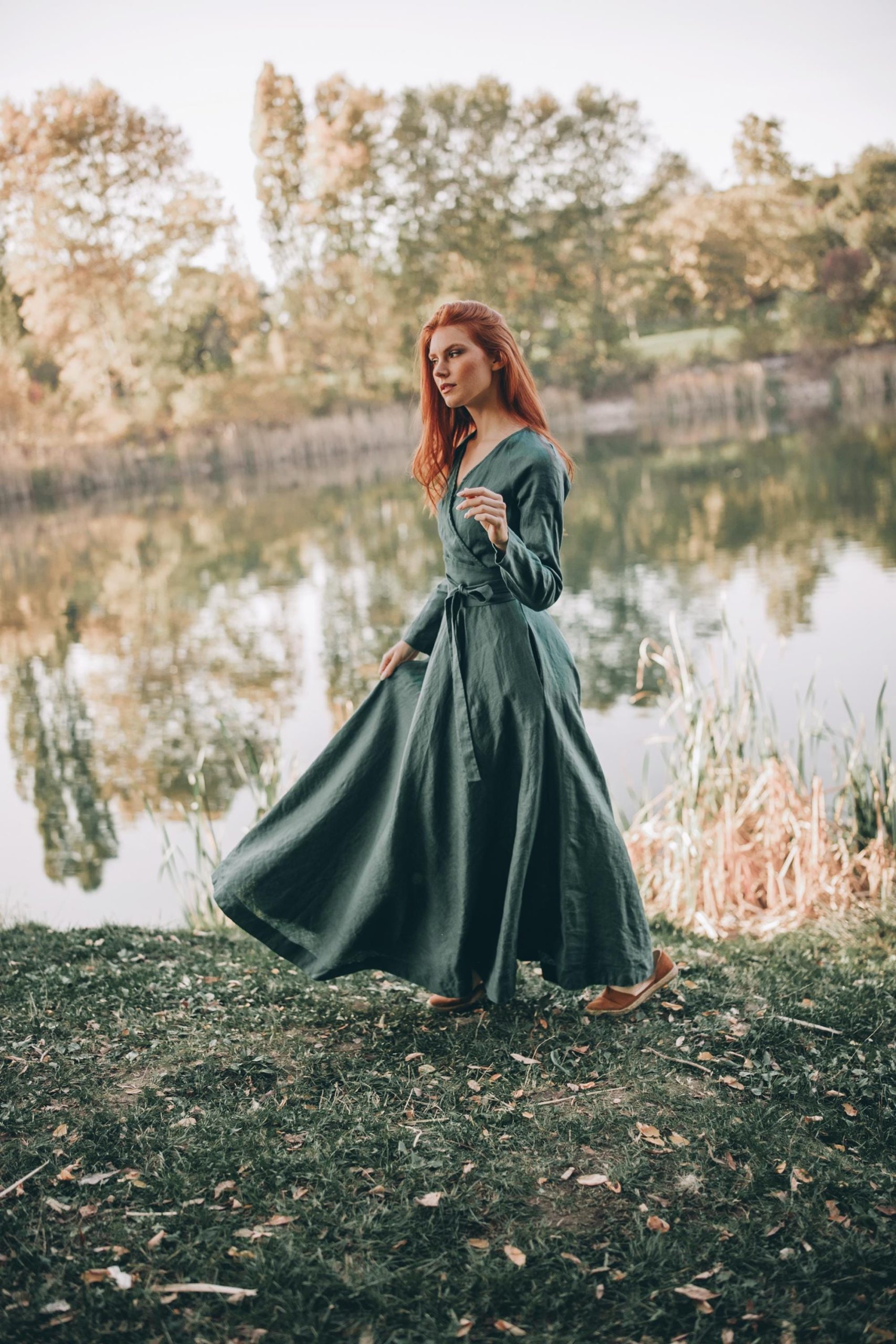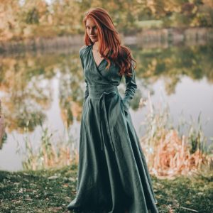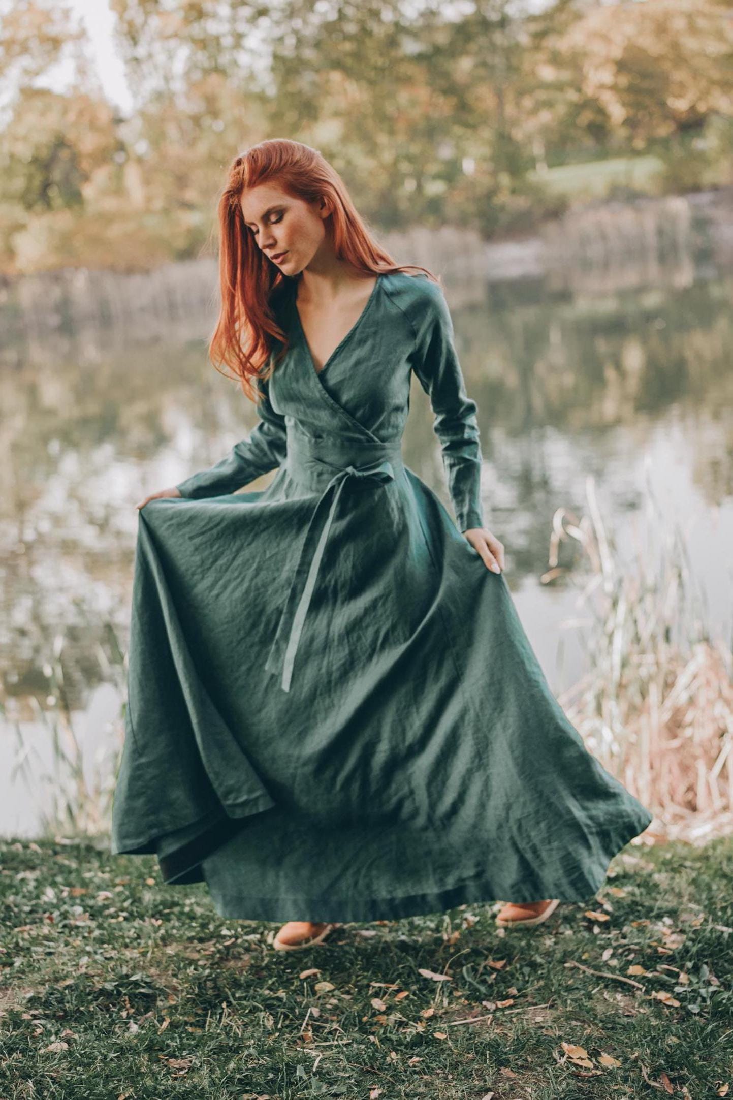 This universally flattering wrap top linen dress will be something you want to wear all the time. It is designed to fit all body shapes. You can wear it either as a loose or fitted dress, as the size can be adjusted. With its two side pockets and long sleeves, it assures irresistible comfort for daily wear. A beautiful alternative of our very much loved long sleeved wrap top dresses, this linen piece is available to order in all the different colors from our palette.