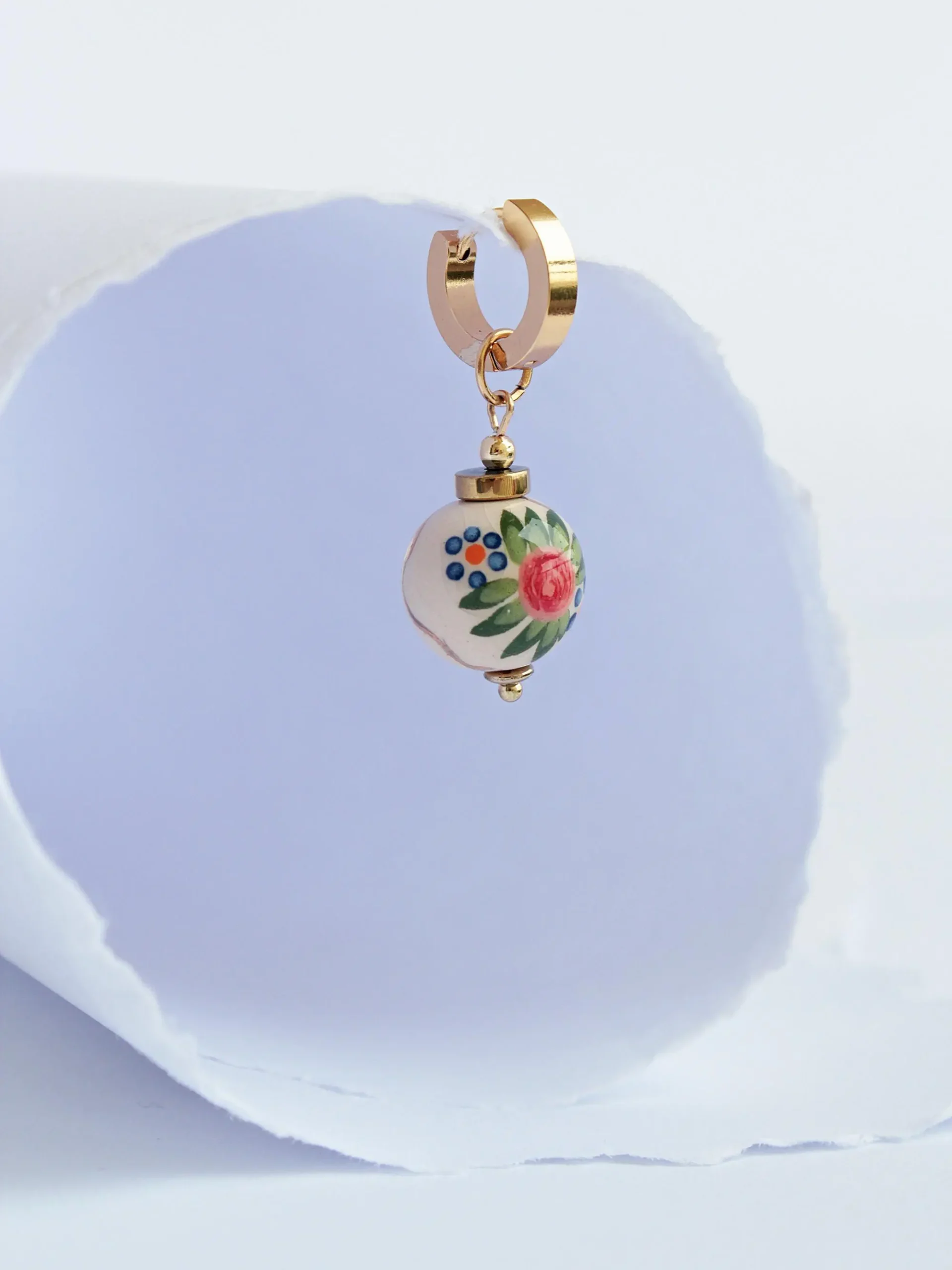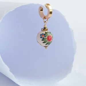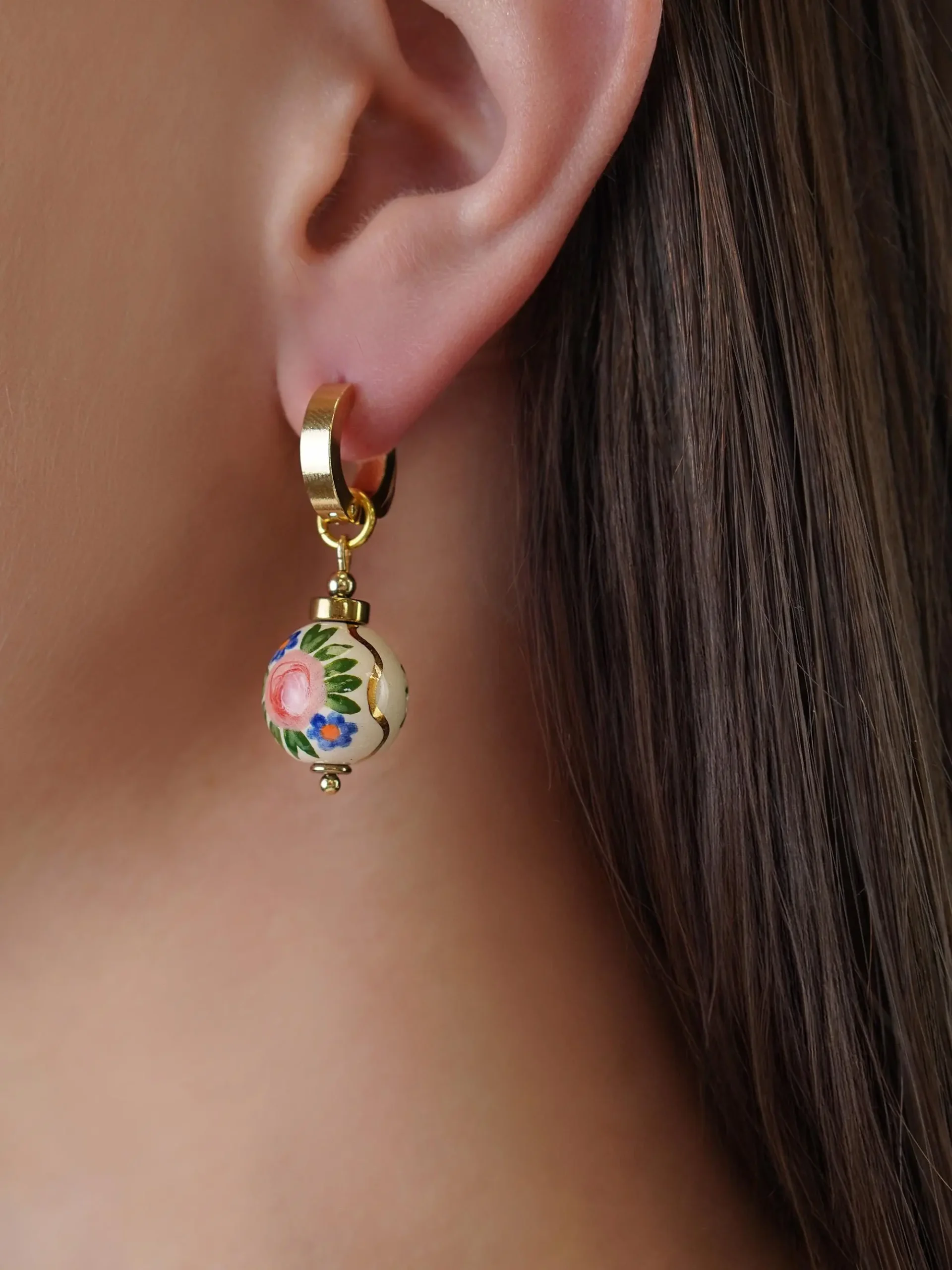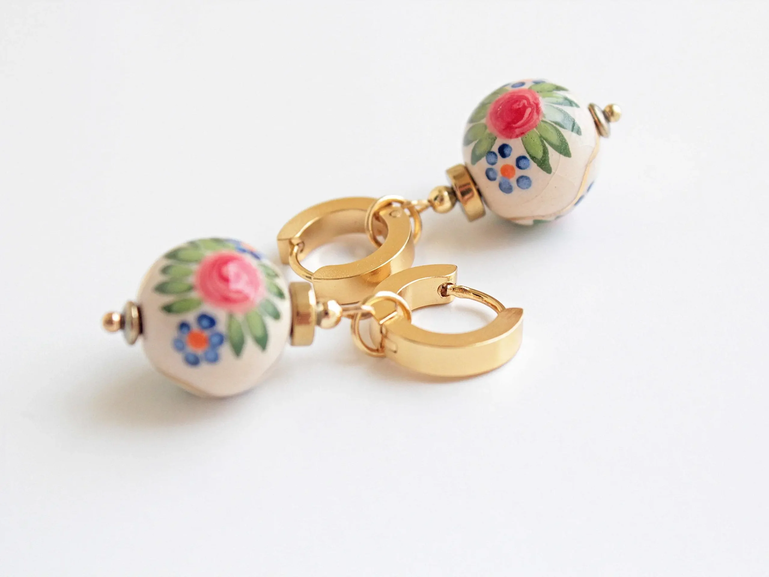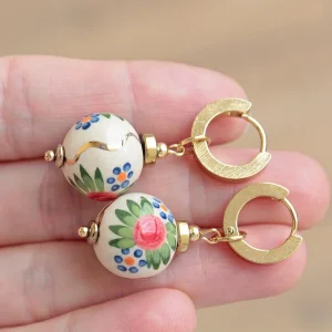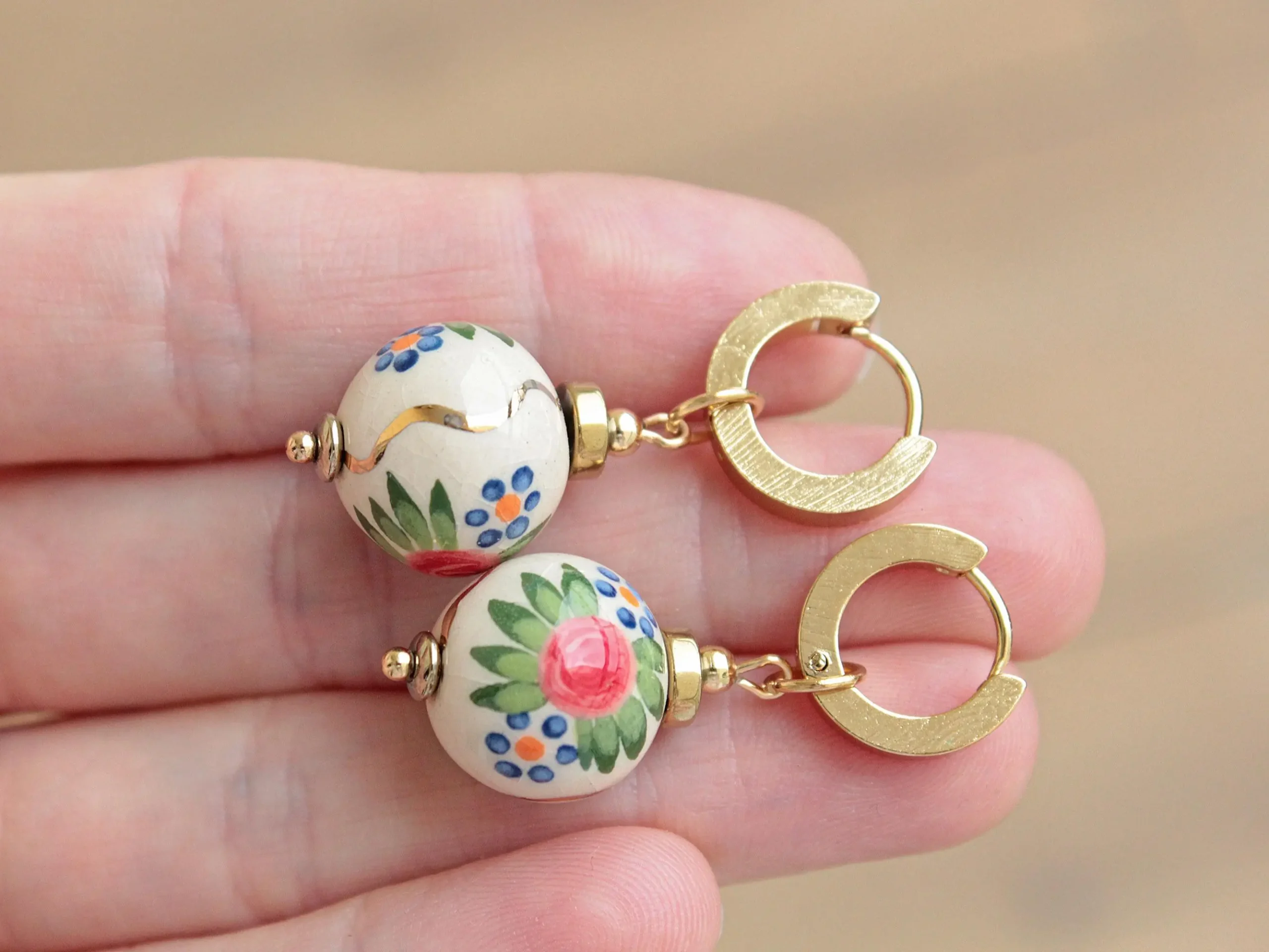 Handmade white clay beads, coated with glaze and original painting; findings are 18K gold-plated brass. Сlasps and findings may have slight differences in design.